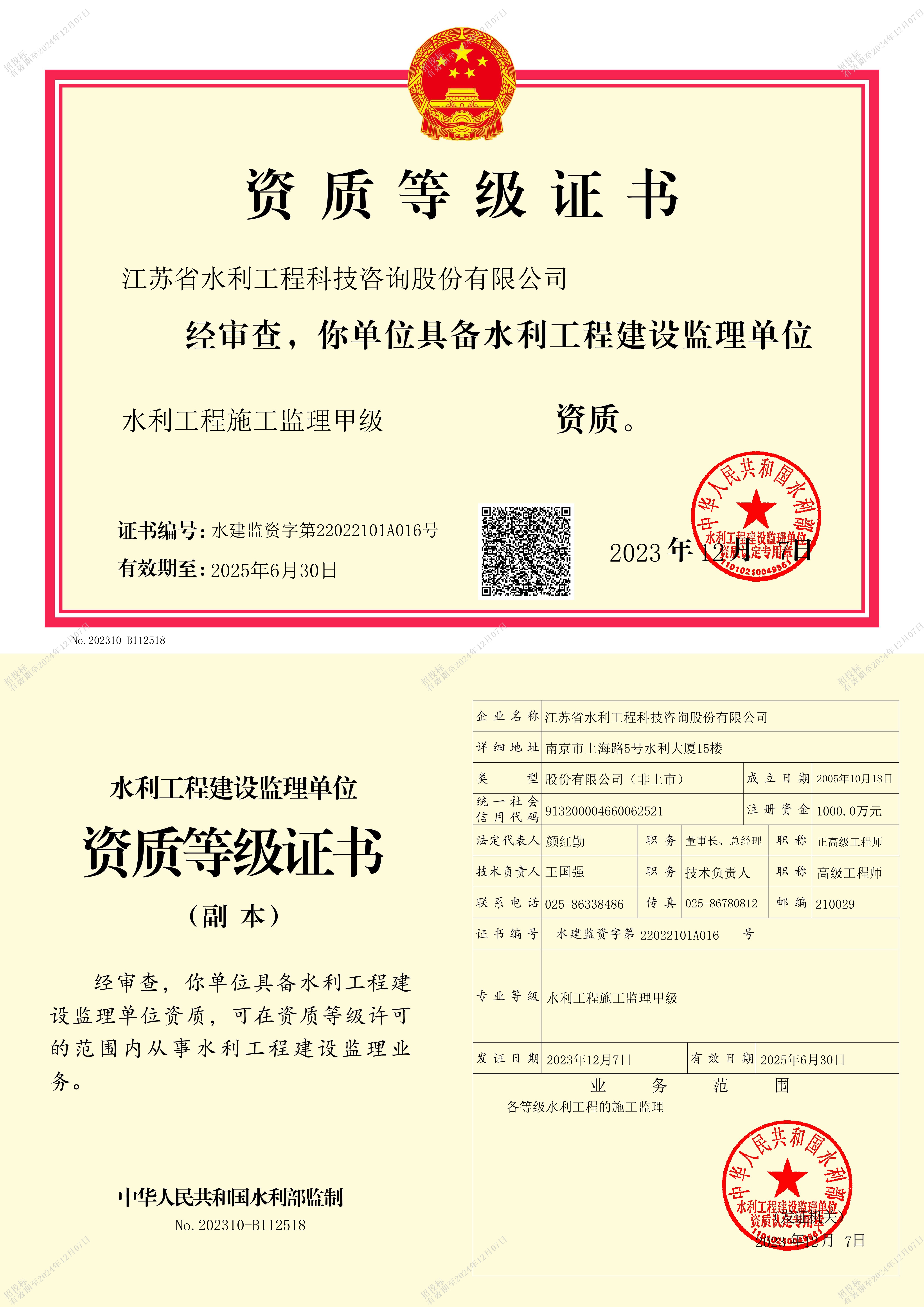 水利工程施工监理甲级资质等级证书